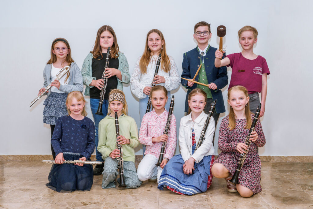 Kinder der Musikschule, die teilweise erst im ersten Unterrichtsjahr sind, durften beim Konzert der „Großen“ drei kurze Stücke zum Besten geben. Unter der Leitung von Philipp Rampetsreiter sorgten sie für Begeisterung beim Kapellmeister Michael Hammerl und dem Publikum.