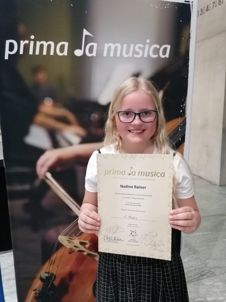 Nadine Rainer erreichte auf der Querflöte in der Altersgruppe B einen 1. Preis beim diesjährigen Wettbewerb Prima la musica. Wir gratulieren herzlich!